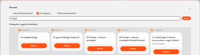 A Katalógusban történő kereséshez kattints a Katalógus menüre (a fejlécben), és add meg a keresett tantárgyat, évfolyamot és a feladatlap típusát (pl. témazáró, házi feladat). A címek és narancssárga címkék segítenek megtalálni a megfelelő feladatlapot, de az Előnézet gombra kattintva a feladatlapot is végig görgetheted. Ha tetszik a feladatlap, és megfelel a céljaidnak, kattints a Másolás az Asztalomra gombra.