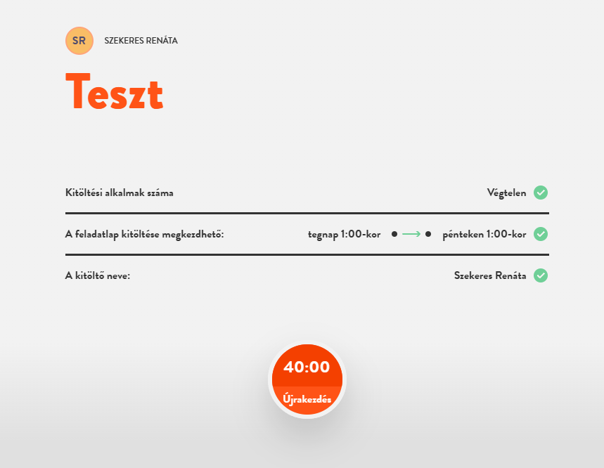 A feladatlap kitöltésének időpontját a feladatlap szerkesztője határozza meg. A beállítással megszabhatja a kitöltés kezdő- és végdátumát, a pontos idővel együtt. Amennyiben az oktató nem állítja be a feladatsor megoldásának dátumát, a feladatlap bármikor kitölthető. A kitöltés megkezdése előtt ezt a beállítást a kitöltési paramétereknél tudod ellenőrizni.