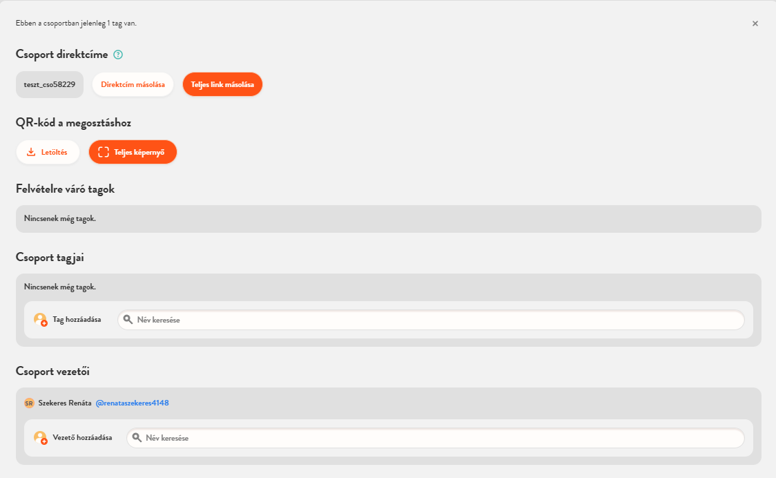 A csoport beállításait a csoporton belül a Csoport szervező gombbal éred el. Ezzel megjelenik a csoport automatikusan generált direktcíme (nem módosítható), a csoport tagjai (és a hozzá tartozó felvételi mező), illetve a csoport vezetők (és a hozzá tartozó felvételi mező).