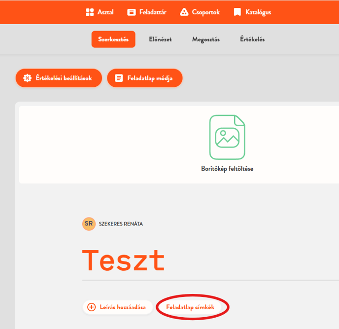 A feladatok szerkesztésének megkezdésekor végezd el a feladatlap címkézést. Add meg a tantárgy, az évfolyam és a feladatlap típusát (pl. házi feladat, szintfelmérő, témazáró stb). Illetve lásd el további, egyedi címkékkel is a könnyebb kereshetőség érdekében! Ezzel saját magadat is segíted, ha vissza szeretnéd keresni a feladatlapjaidat, hiszen olyan egyedi kulcsszavak alapján is kereshetsz, amit Te magad állítottál be az adott feladatlapra vonatkozóan. Próbálj meg releváns címkéket alkalmazni, hogy könnyen megjegyezhető legyen! A címkézéshez kattints a Feladatlap címkék gombra.