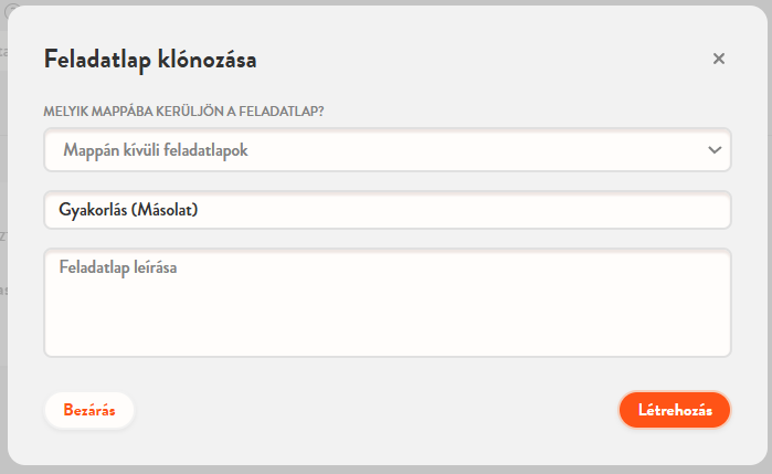 Másoláskor a megjelenő ablak segítségével beállíthatod, hogy a klónozott feladatlap mely mappába kerüljön, milyen címmel és leírással. Ha ezeket a beállításokat elvégezted, a Létrehozás feliratra kattintva a másolt feladatlap szerkesztőfelületére kerülsz.