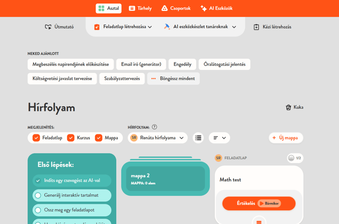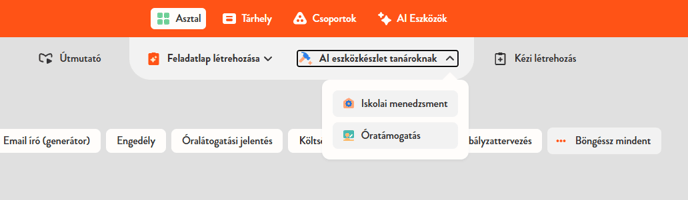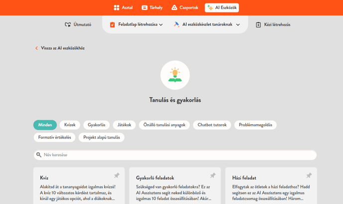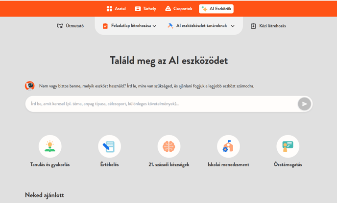 A főmenüben láthatsz egy AI eszközök gombot, amelyre kattintva áttekintheted az összes elérhető AI eszközt. Ezek az eszközök segítenek feladatlapok, óratervek és egyéb tananyagok elkészítésében.