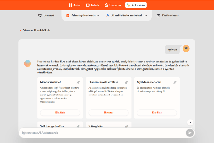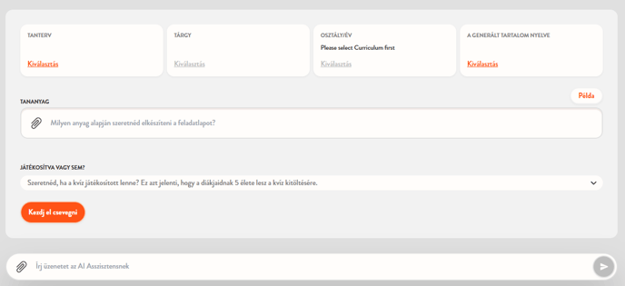 Bármely AI asszisztens használatához egyszerűen kattints az Elindítás gombra, majd válaszd ki a tantervet, tantárgyat, évfolyamot és nyelvet. Feltöltheted saját anyagaidat is, vagy írhatsz egy rövid leírást, hogy az AI pontosabb eredményt adjon.