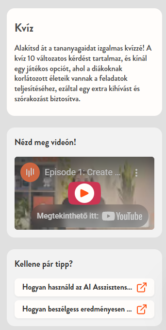 Minden eszközhöz tartozik egy videós útmutató a képernyő bal oldalán, amely lépésről lépésre bemutatja a használatát. Alatta tippeket, blogbejegyzéseket és segítő cikkeket is találhatsz.